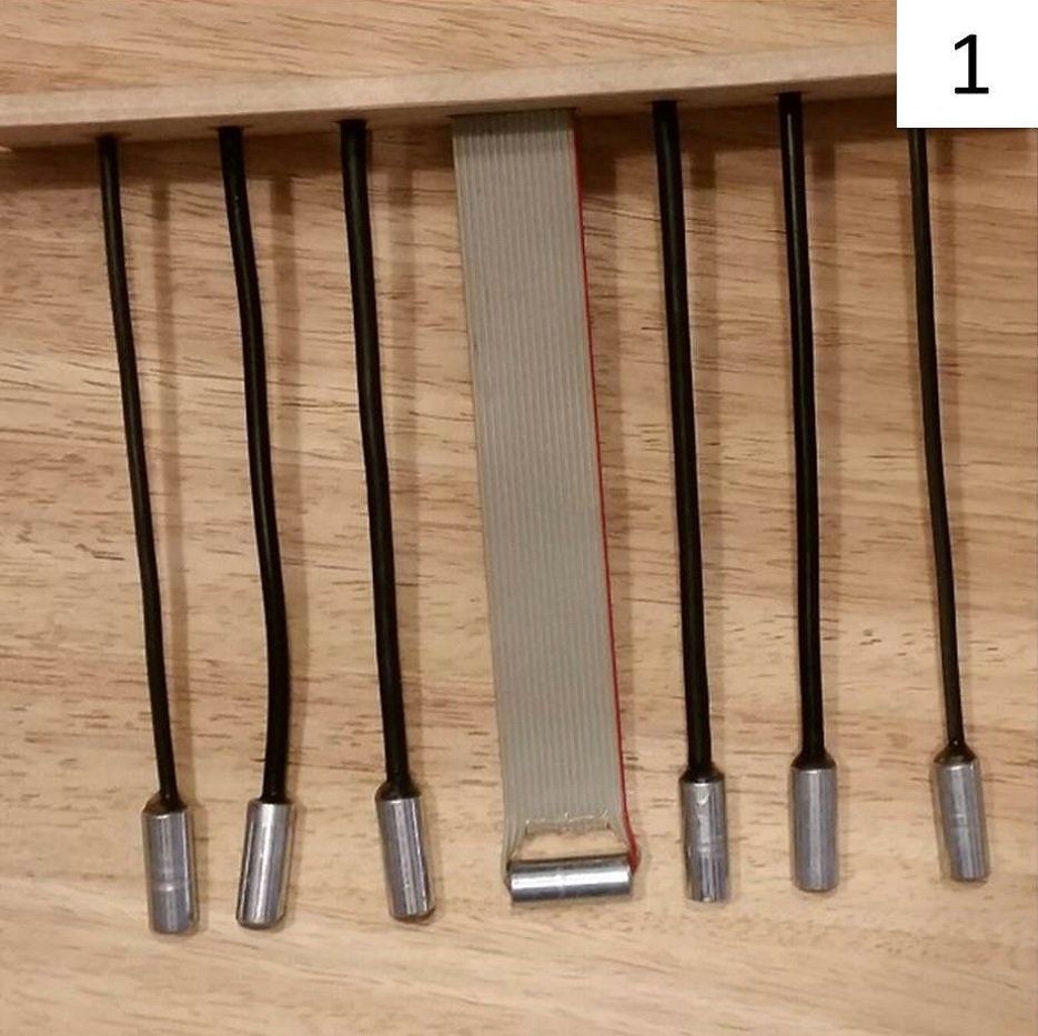 Zwei Träger aus Holz, einer bestückt mit sieben Kabeln und einer mit drei Gehäusehülsen, wurden zwei Monate lang im Bienenstock jeweils in eine Wabengasse Nest nah eingehängt.