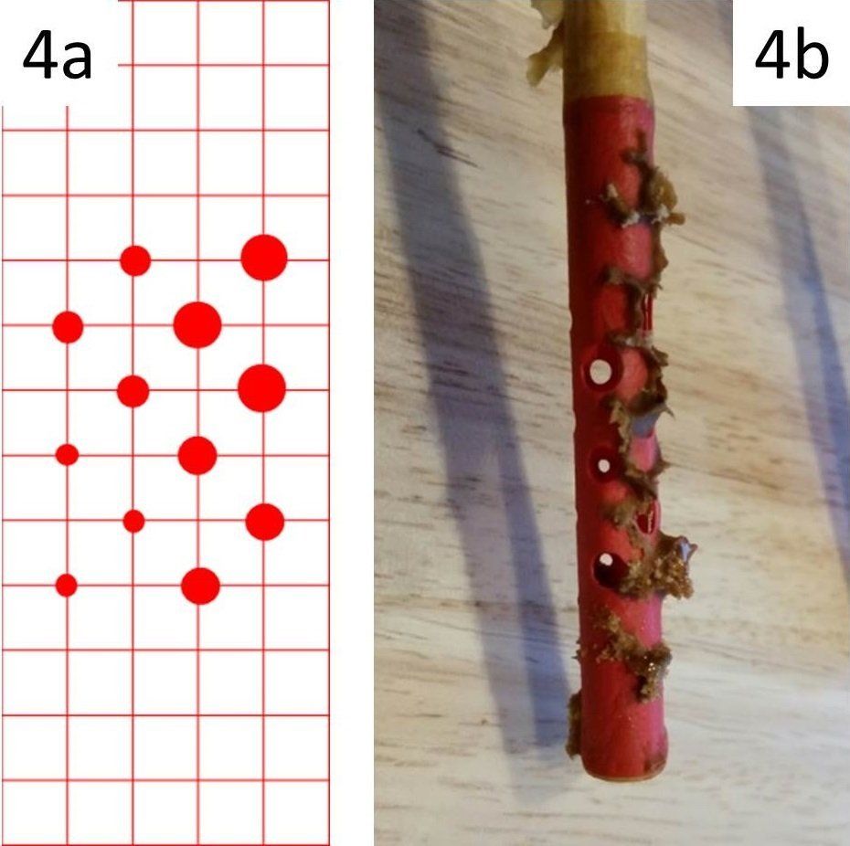 4a Muster der Öffnungen von den Gehäusehülsen; 4b Verklebung nach zwei Monaten in der Wabengasse